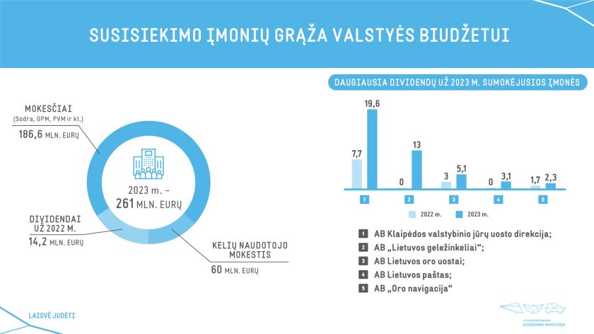Susisiekimo ministerijos įmonių grąža valstybės biudžetui už 2023 m. – 261 mln. eurų
