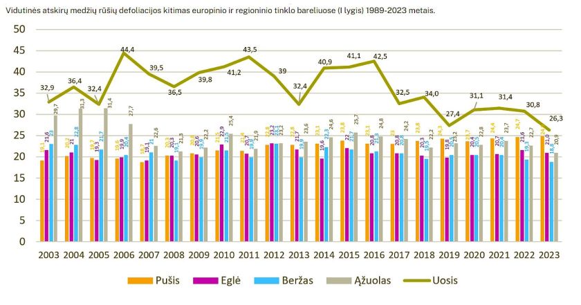Lietuvos miškuose eglių lajų defoliacija (spyglių masės praradimas dėl nepalankių aplinkos veiksnių) tendencingų pokyčių nerodo. Tai liudija gerą žaliomis išlikusių eglių gyvybingumą. 2024 metų birželio 26 d. Lietuvos Respublikos Vyriausybė patvirtino 2024-2029 metų Valstybinę aplinkos monitoringo programą, pagal kurią nuolat sistemingai renkama informacija apie šalies gamtinės aplinkos būklę, joje vykstančius savaiminius ir dėl antropogeninio poveikio atsirandančius pokyčius. Rengiant programą aktyviai dalyvavo Valstybinės miškų tarnybos Nacionalinės miškų inventorizacijos skyriaus vedėjas Gintaras Kulbokas. ICP_Forests_leidinys_2023.jpgUž programos Gyvosios gamtos srities 2.1 ir 3.1 priemones atsakinga Valstybinė miškų tarnyba. Ji vykdo I lygio ir organizuoja intensyvų II lygių miškų būklės monitoringus. Šie monitoringai vykdomi pagal tarptautinę ICP Forests programą, o tarnyba yra nacionalinis ICP Forests…