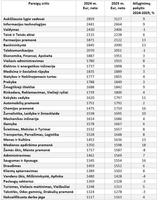 Didžiausi atlyginimai 2025 m. ir toliau mokami informacinių technologijų, valdymo srities darbuotojams ir aukščiausio lygio vadovams. Aukščiausio lygio vadovų atlyginimo vidurkis “į rankas” per metus augo iki 3 127 Eur (+9 proc.), IT specialistų – iki 2 664 Eur (+9 proc.).