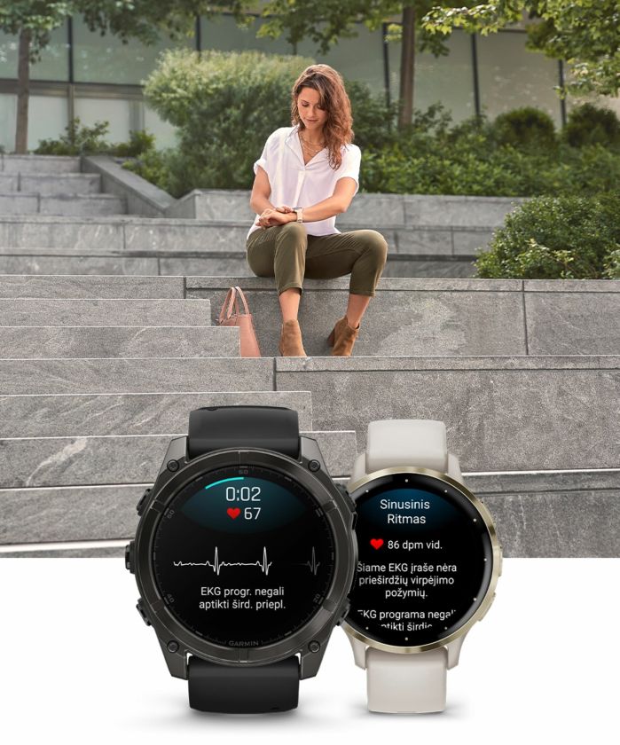 EKG bet kuriuo metu parodo širdies veikimo ritmą ir leidžia suprasti, ar širdis dirba tolygiai ir nėra prieširdžių virpėjimo. Naudodami EKG programėlę laikrodžių savininkai gali įrašyti 30 sek. trukmės kardiogramą ir gautus rezultatus iš karto peržiūrėti savo išmaniajame įrenginyje arba išmaniojo telefono programėlėje „Garmin Connect“.