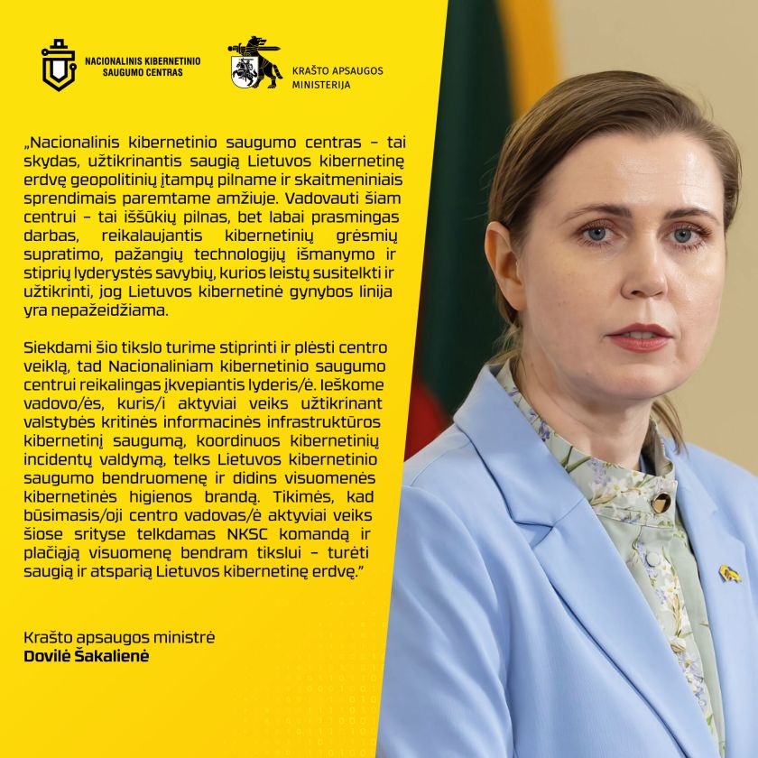 Nacionalinis kibernetinio saugumo centras (NKSC) prie Krašto apsaugos ministerijos ieško naujo vadovo, kuris užtikrintų valstybės kritinės informacinės infrastruktūros kibernetinį saugumą, koordinuotų incidentų valdymą, telktų kibernetinio saugumo bendruomenę ir stiprintų visuomenės atsparumą grėsmėms. Tai atsakinga ir prasminga pozicija, reikalaujanti strateginio mąstymo, technologinių žinių ir stiprios lyderystės, sako krašto apsaugos ministrė Dovilė Šakalienė.